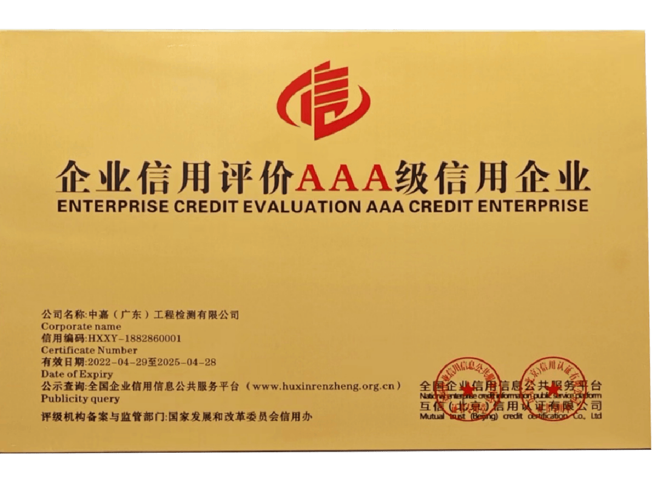 被廣東省建設(shè)工程質(zhì)量安全檢測和鑒定協(xié)會評為雙A信用等級
